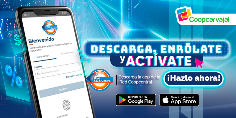 - Para realizar transacciones el asociado debe descargar la App de la Red Coopcentral desde su App Store o Play Store y crearlos con los datos registrados en Coopcarvajal.